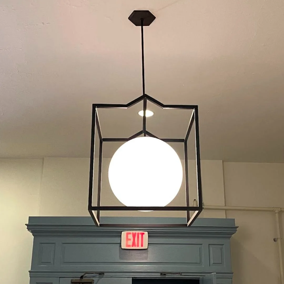 As an homage to the globe lights that were in the West Room until February 2025, a new light fixture was added to the meetinghouse lobby. The fixture includes a smaller replica globe light and is encased in a metal frame with a silhouette referencing ASMH itself.